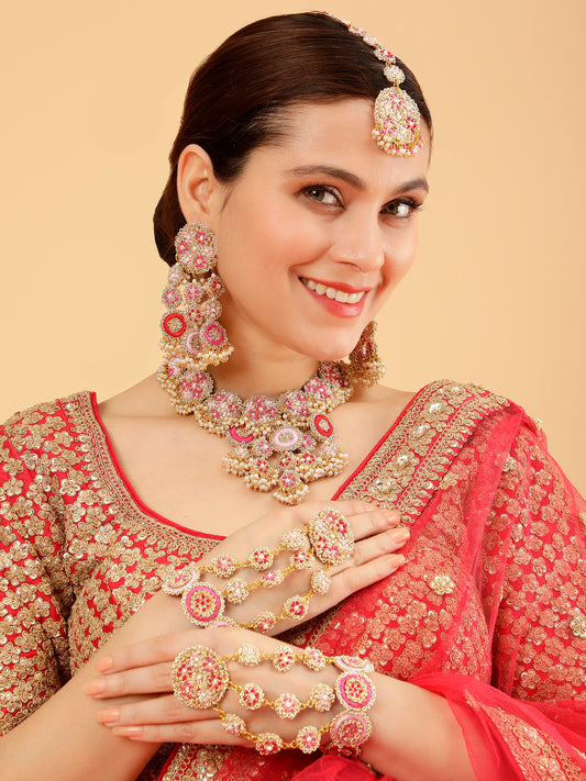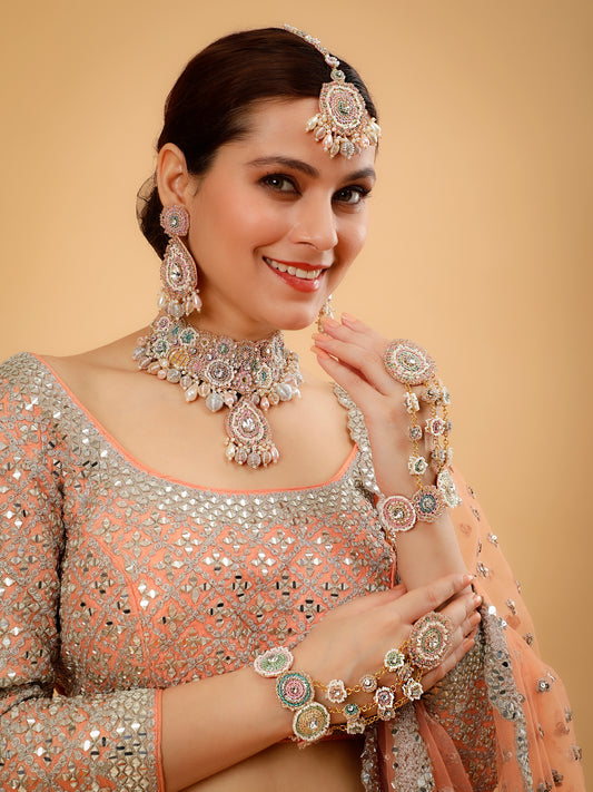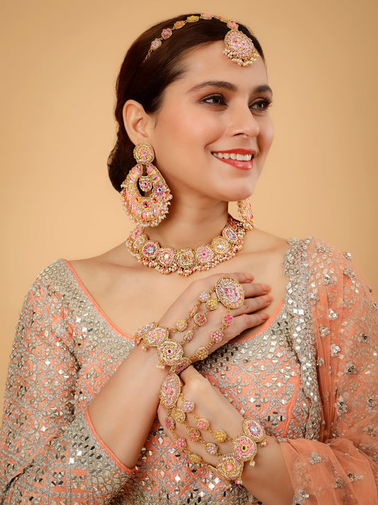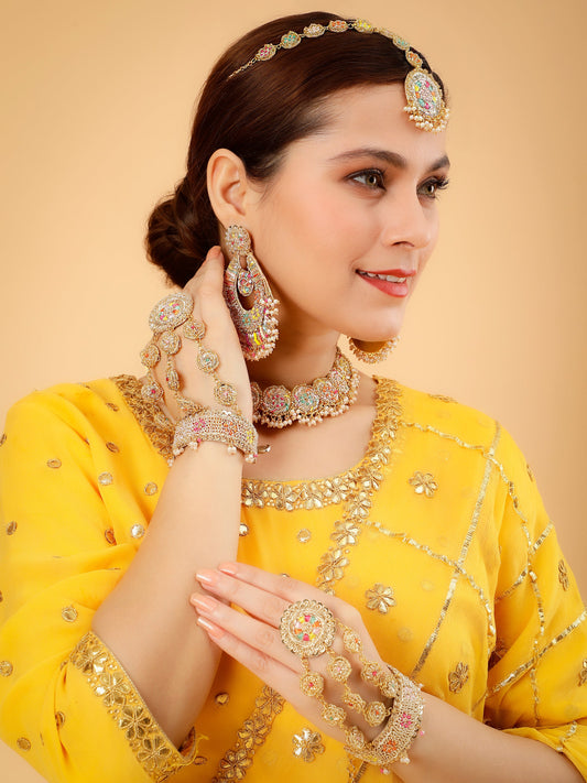 Gul Sitara Gold (Earrings with Earchains, Mathapatti, Choker & Pair of Hathphool Set)