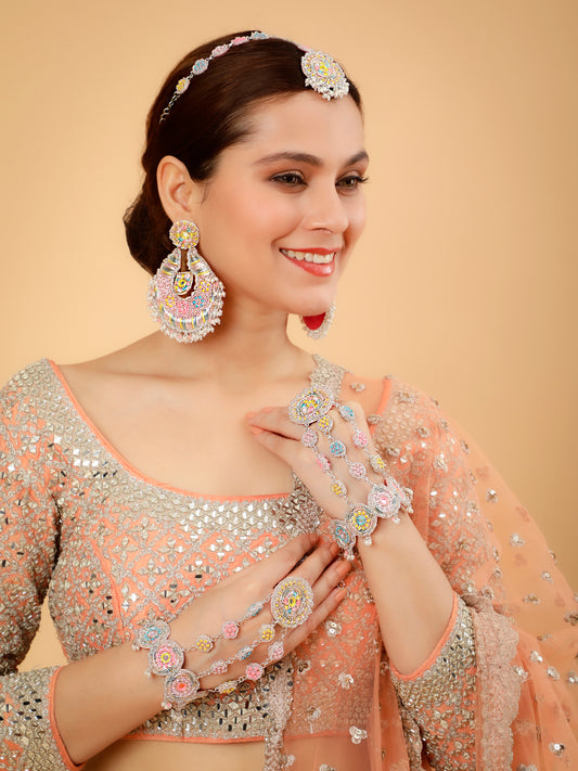 Firoza (Earrings with Earchains, Mathapatti, Sleek Necklace, Long Necklace & Pair of Hathphool Set)