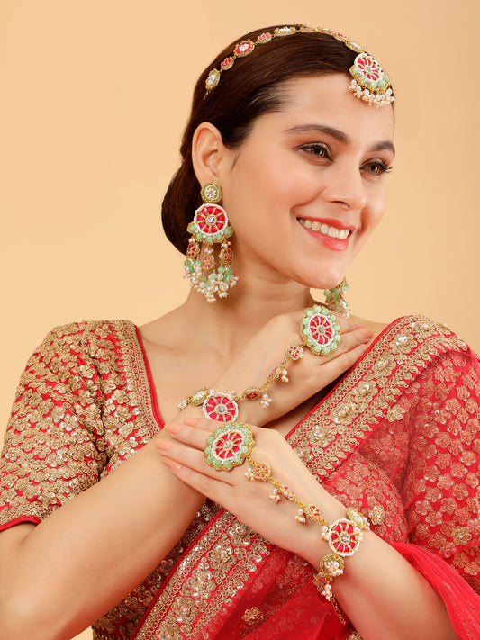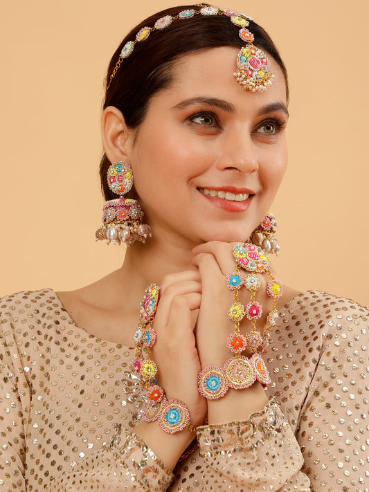 Gul Sitara Gold (Earrings with Earchains, Mathapatti & Pair of Hathphool with Embroidered Latkans Set)