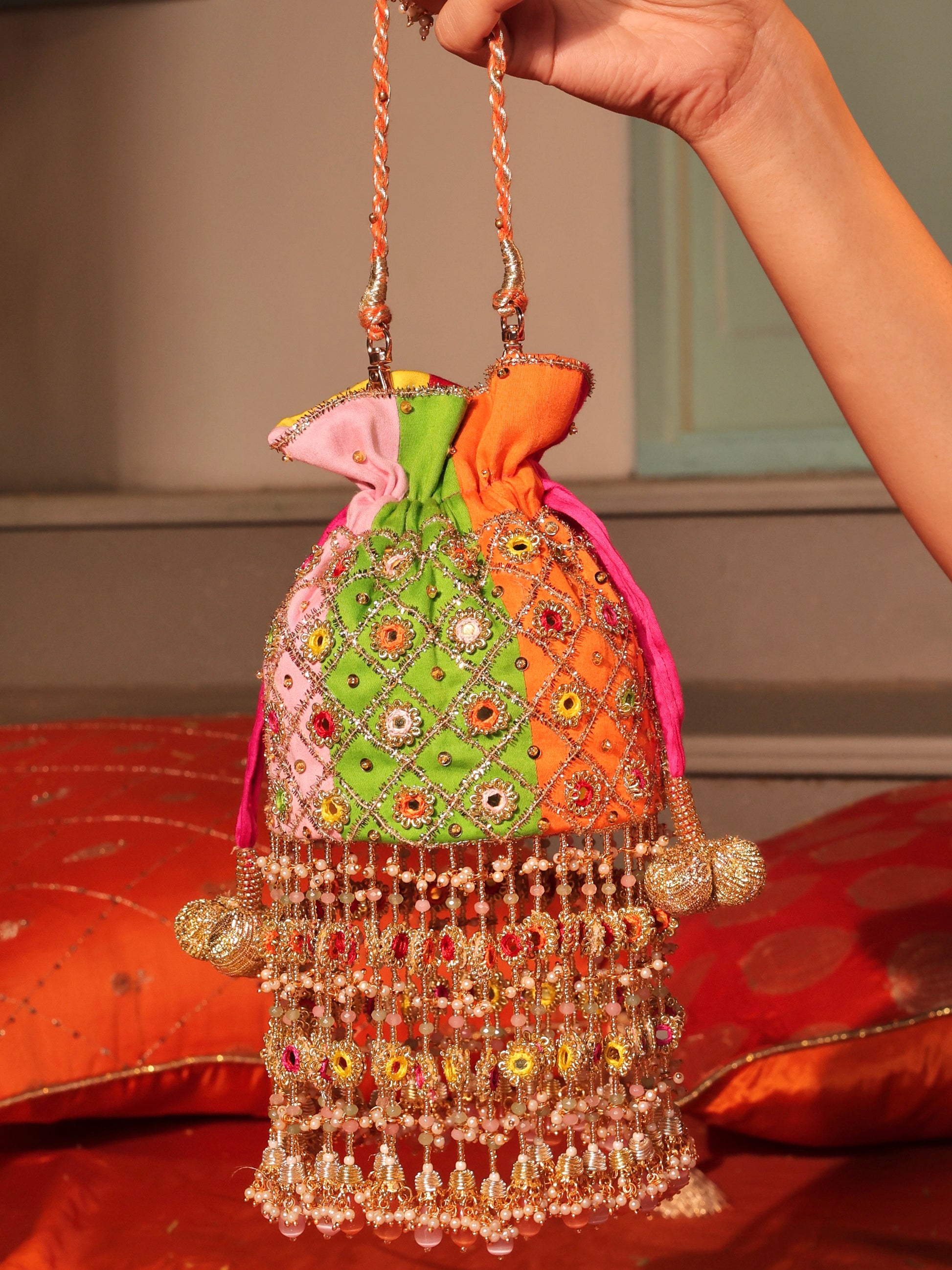 Store in the packaging away from moisture and sunlight. Use fillers to maintain the potli's shape when it's not in use. Dust off or wipe the stains immediately with a slightly damp, lint-free cloth. Do not wash or dry clean.