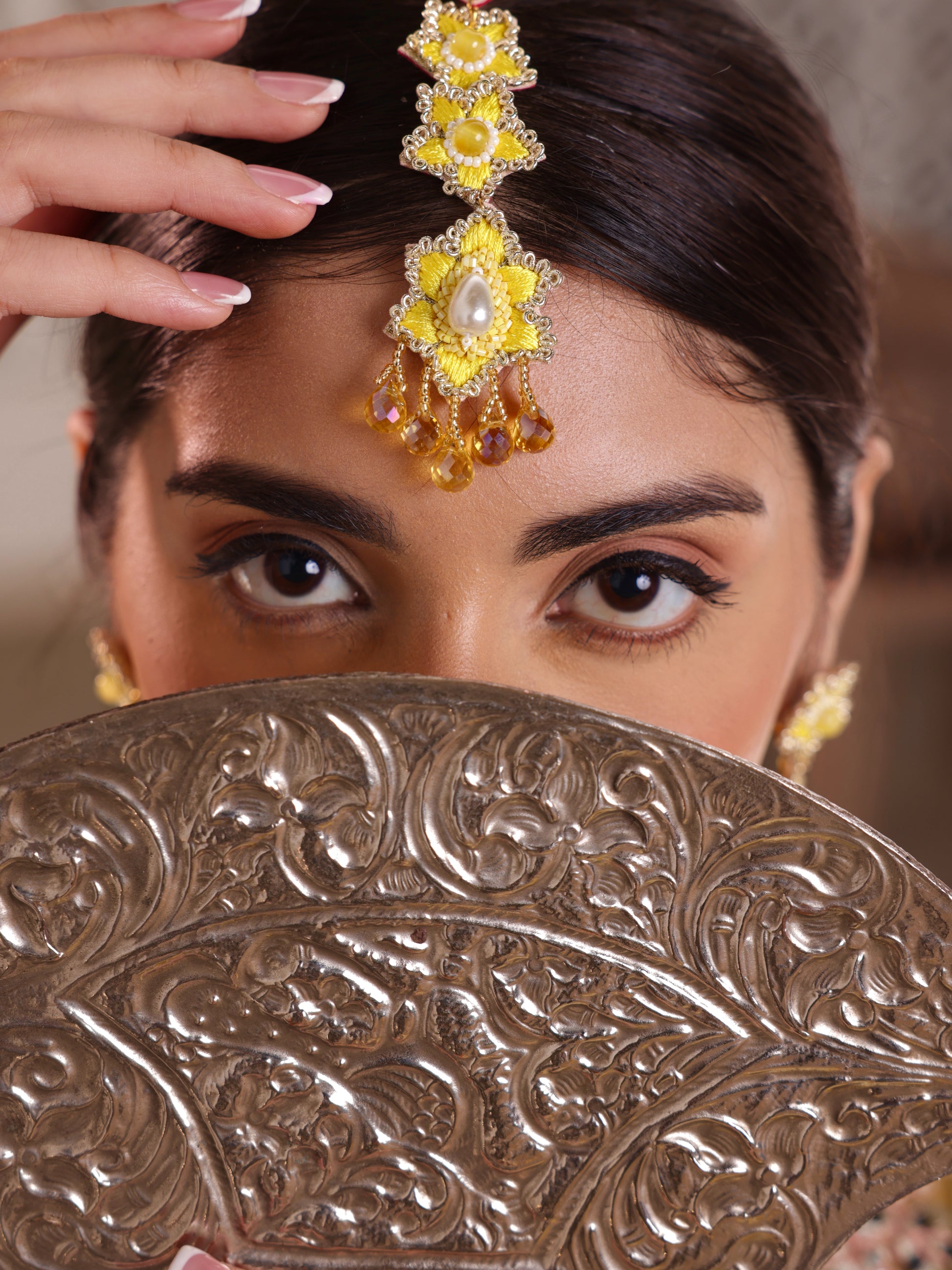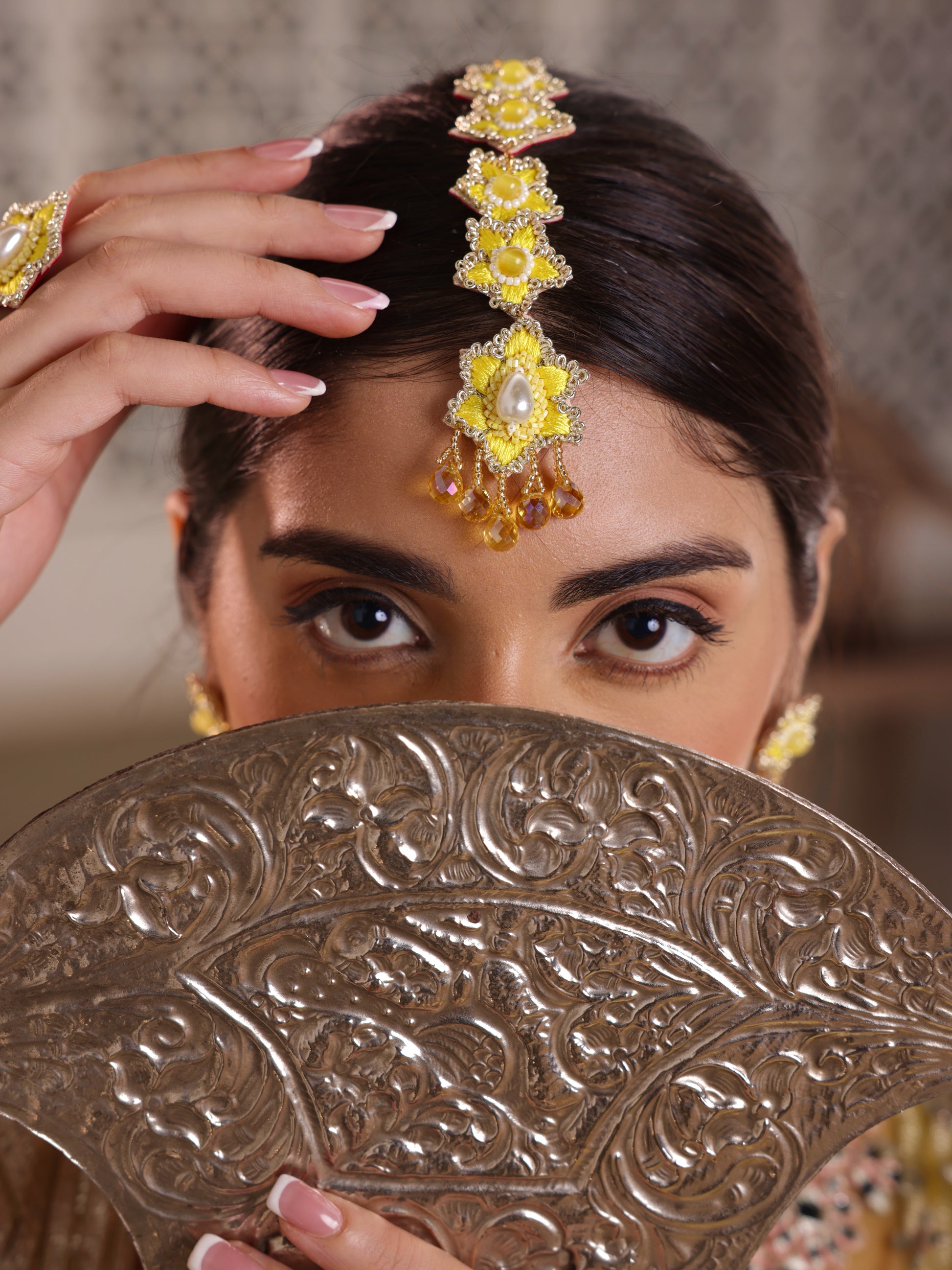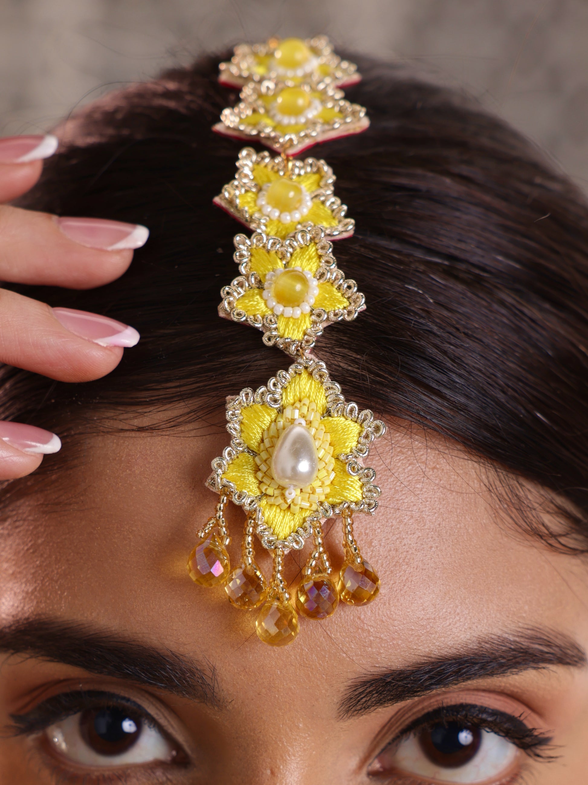 This exquisite floral collection is handcrafted with delicate resham thread, featuring intricate pearls and crystal drops that add a touch of sparkle. Perfect for your Haldi ceremony, the design is composed of tiny, vibrant flowers, creating a light, fun, and feminine vibe. Each pair is uniquely crafted to stand out, offering a fresh and eye-catching elegance that will complement any traditional ensemble beautifully.