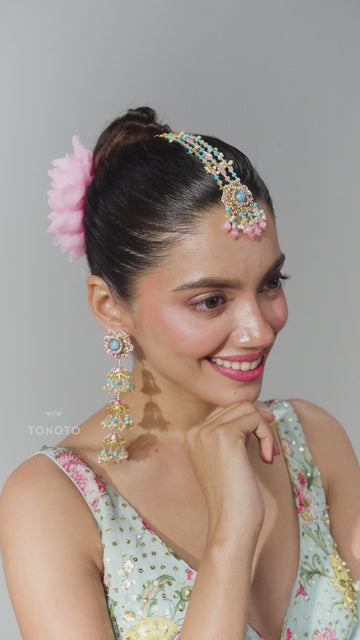 This couture piece from the Dilruba Collection unfolds as a romantic celebration of blooming chintz florals, where delicate blossoms and playful parrots rest across a serene ivory and ice blue canvas. Light, fluid and effortlessly feminine, the silhouette moves with quiet grace. Intricate pitta embroidery, subtle sequins and metal floral accents lend depth to the print, while stone and thread tassels add a final touch of understated glamour.