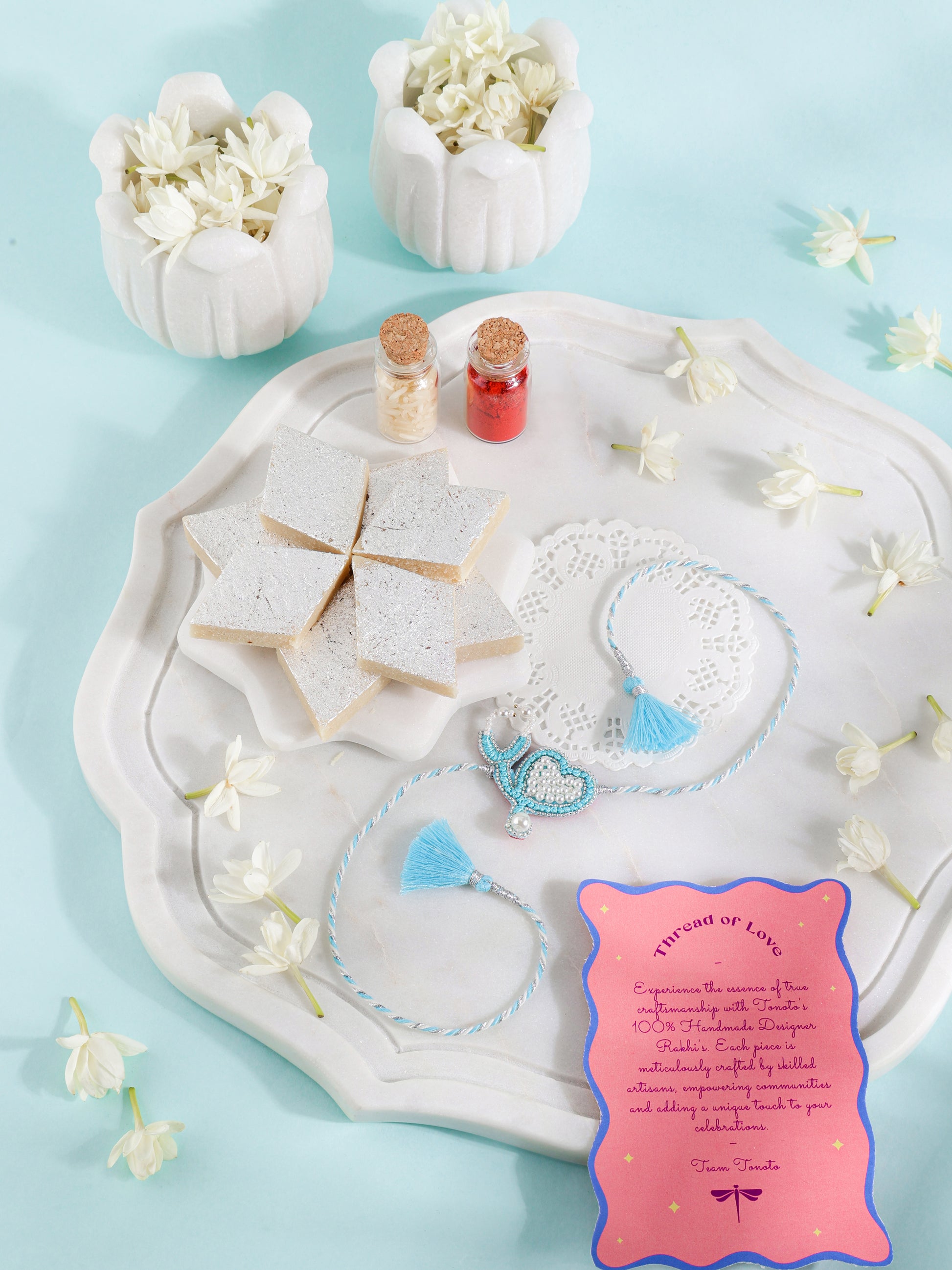 Each box accommodates up to eight Rakhis, featuring Tonoto’s special Rakhi theme. Rakhis are secured on heart-shaped cards. Enhance your gift with optional roli chawal, a personalized note, or select from our range of gift boxes or hampers for an additional charge.