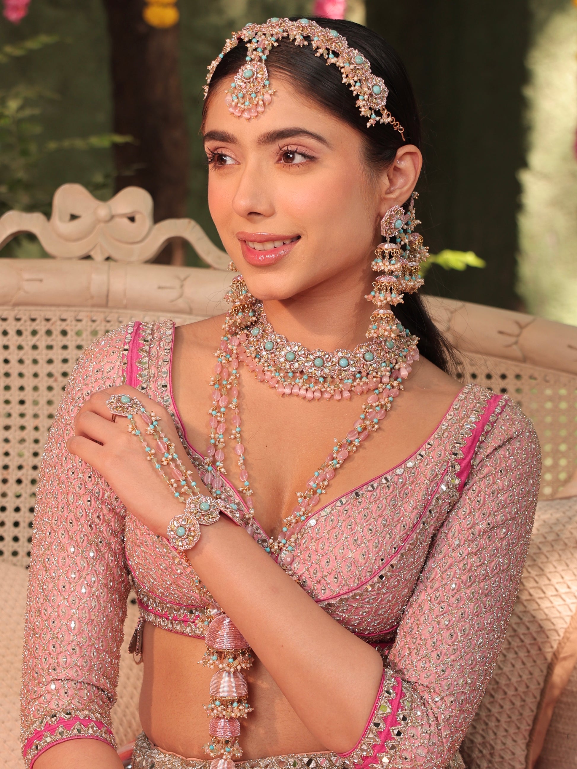 Firoza (Earrings with Earchains, Mathapatti, Sleek Necklace, Long Necklace & Pair of Hathphool with Kaleeras Set)