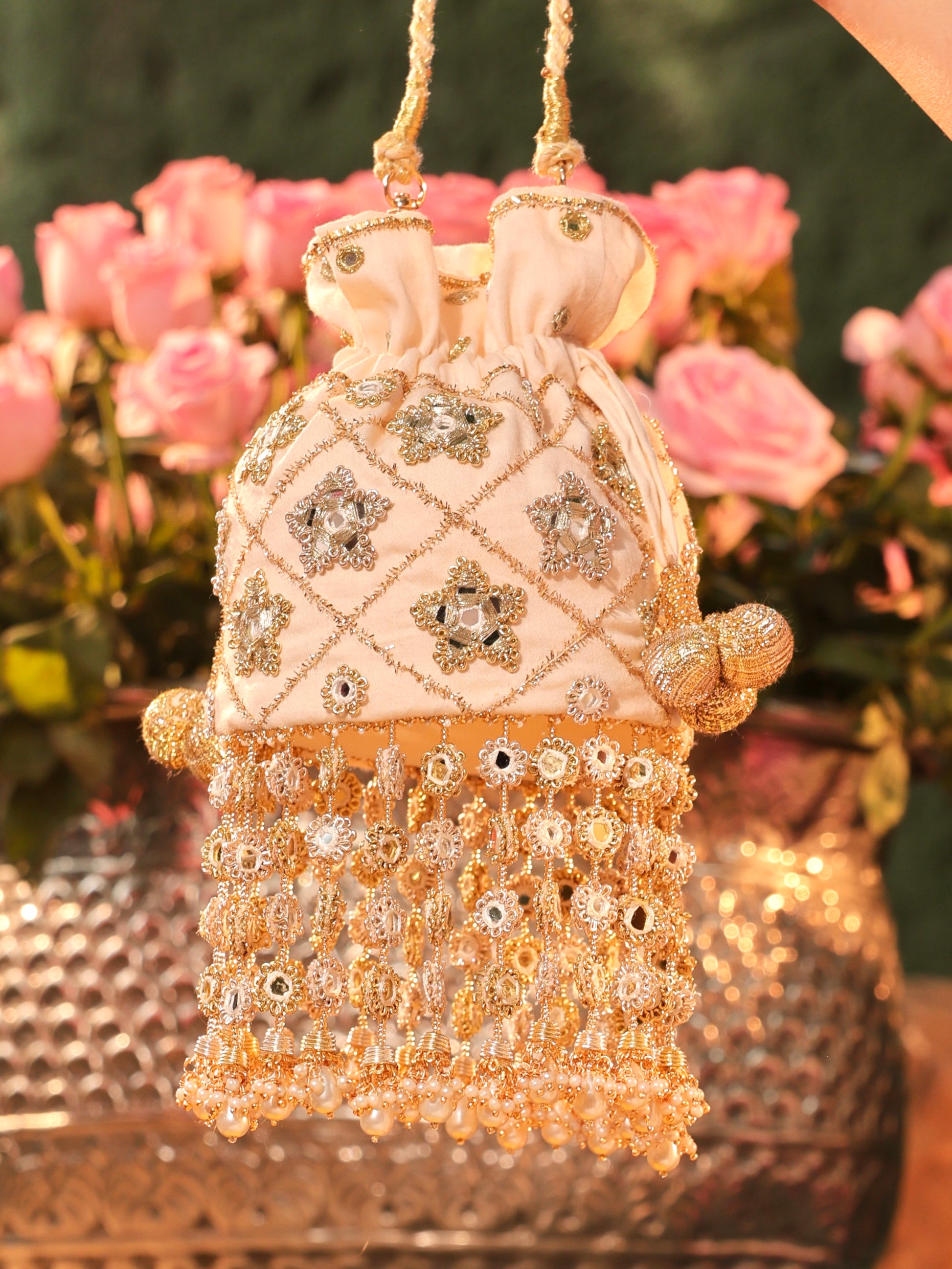 Store in the packaging away from moisture and sunlight. Use fillers to maintain the potli's shape when it's not in use. Dust off or wipe the stains immediately with a slightly damp, lint-free cloth. Do not wash or dry clean.
