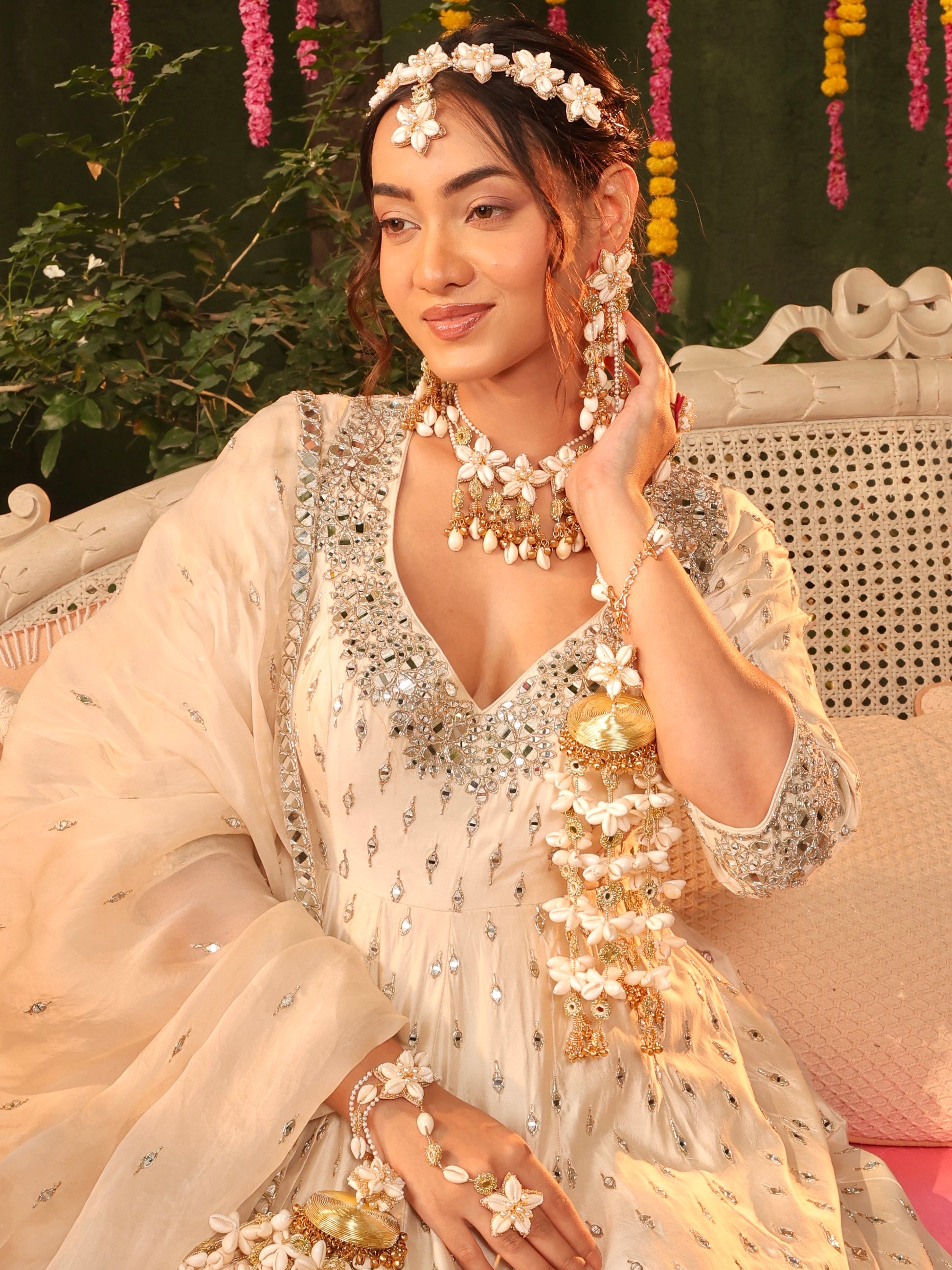 Kaju Katli Cowrie (Earrings, Mathapatti, Choker & Pair of Hathphool with Kaleeras Set)