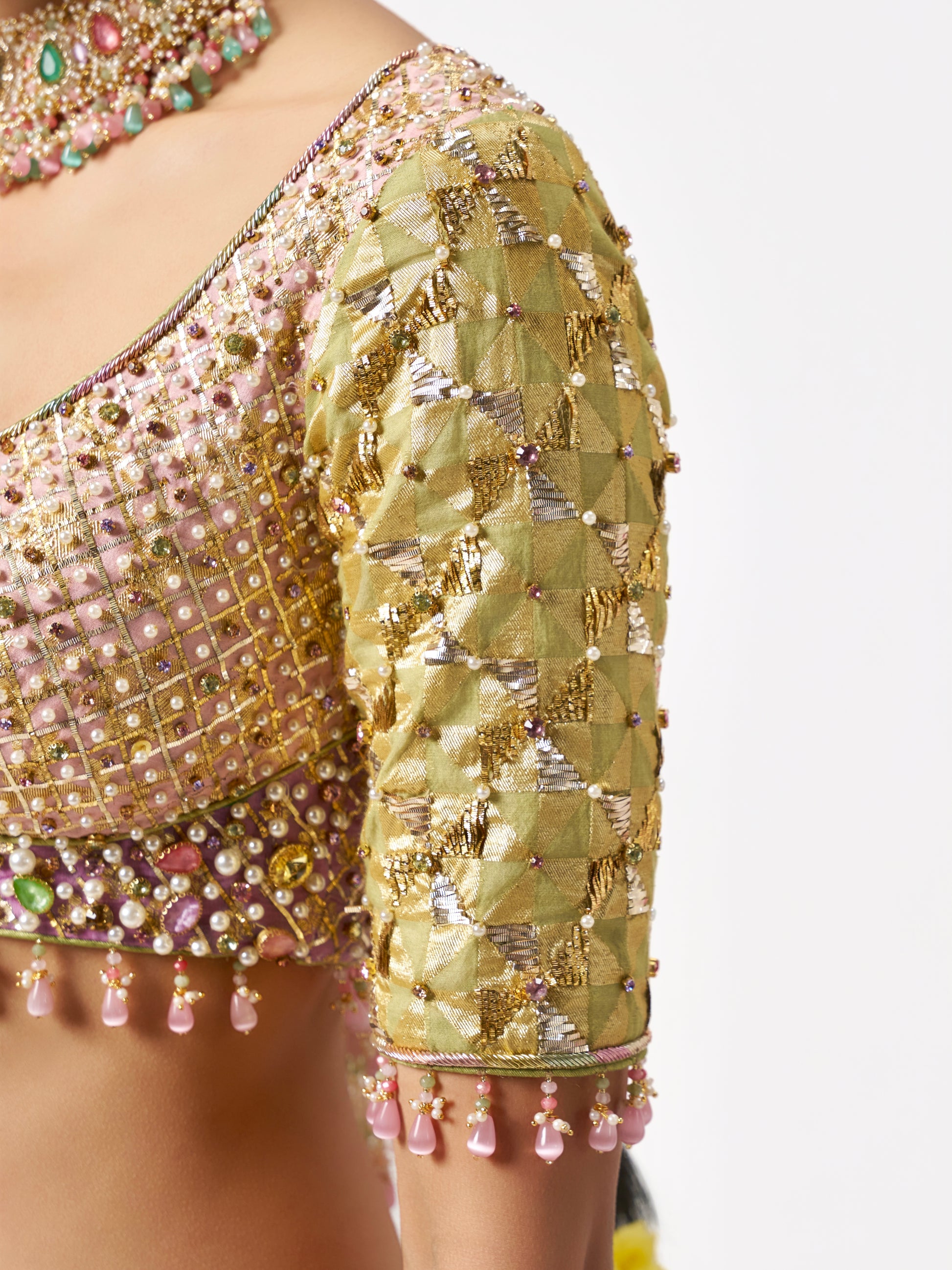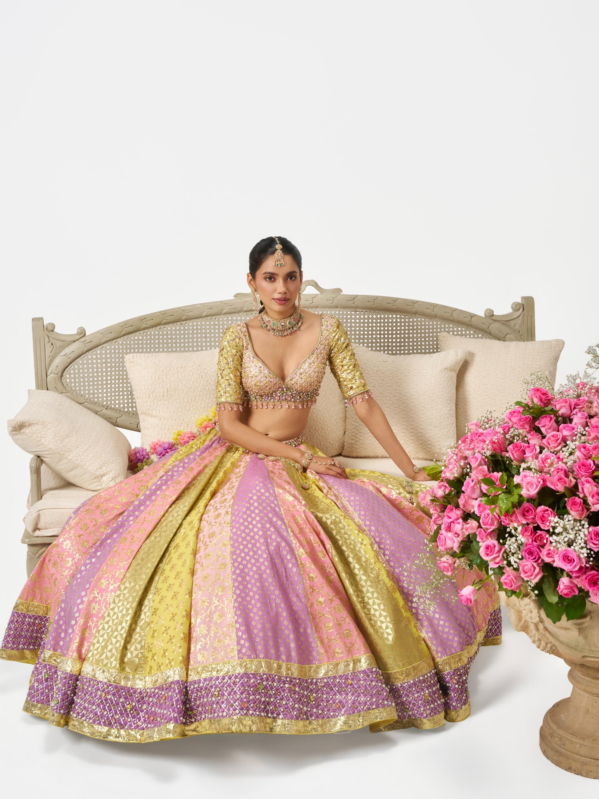 This couture piece from the Mehbooba Collection brings together handloom Chanderi, natural dyes and intricate detailing in a composition that feels ethereal yet modern, rooted yet beautifully free-spirited. The soft, feminine palette carries effortless charm, while delicate pearl and Swarovski embroidery lends a luminous touch of glamour, creating a look that feels playful, refined and perfect for the contemporary bride.