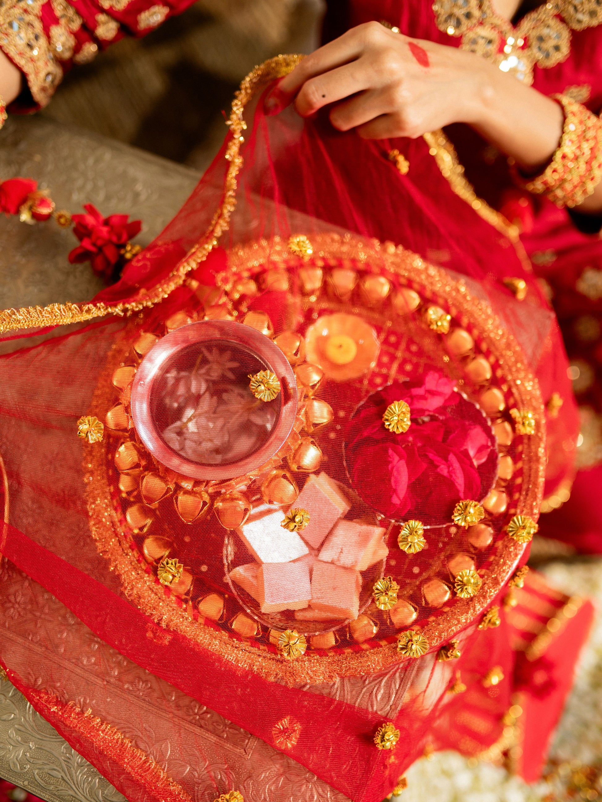 Material: Sindoor theme | Red & Gold palette | Mirror, Resham, Ghungroo, Dabka, Moti Pearls