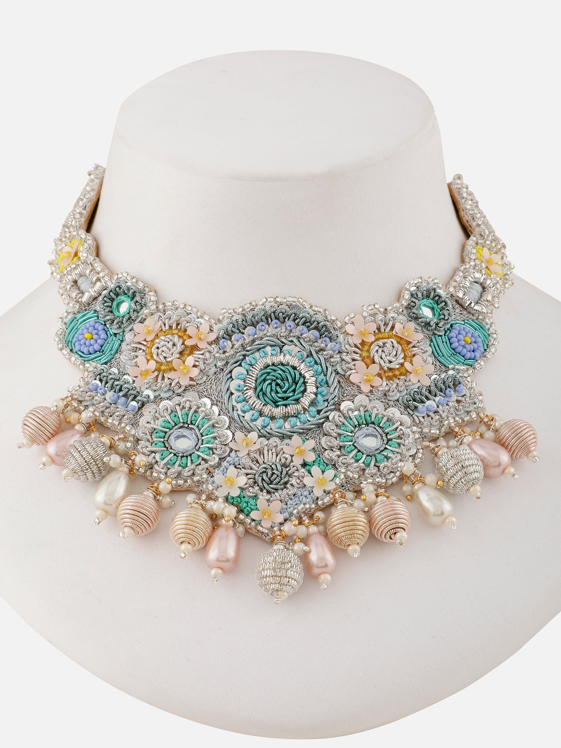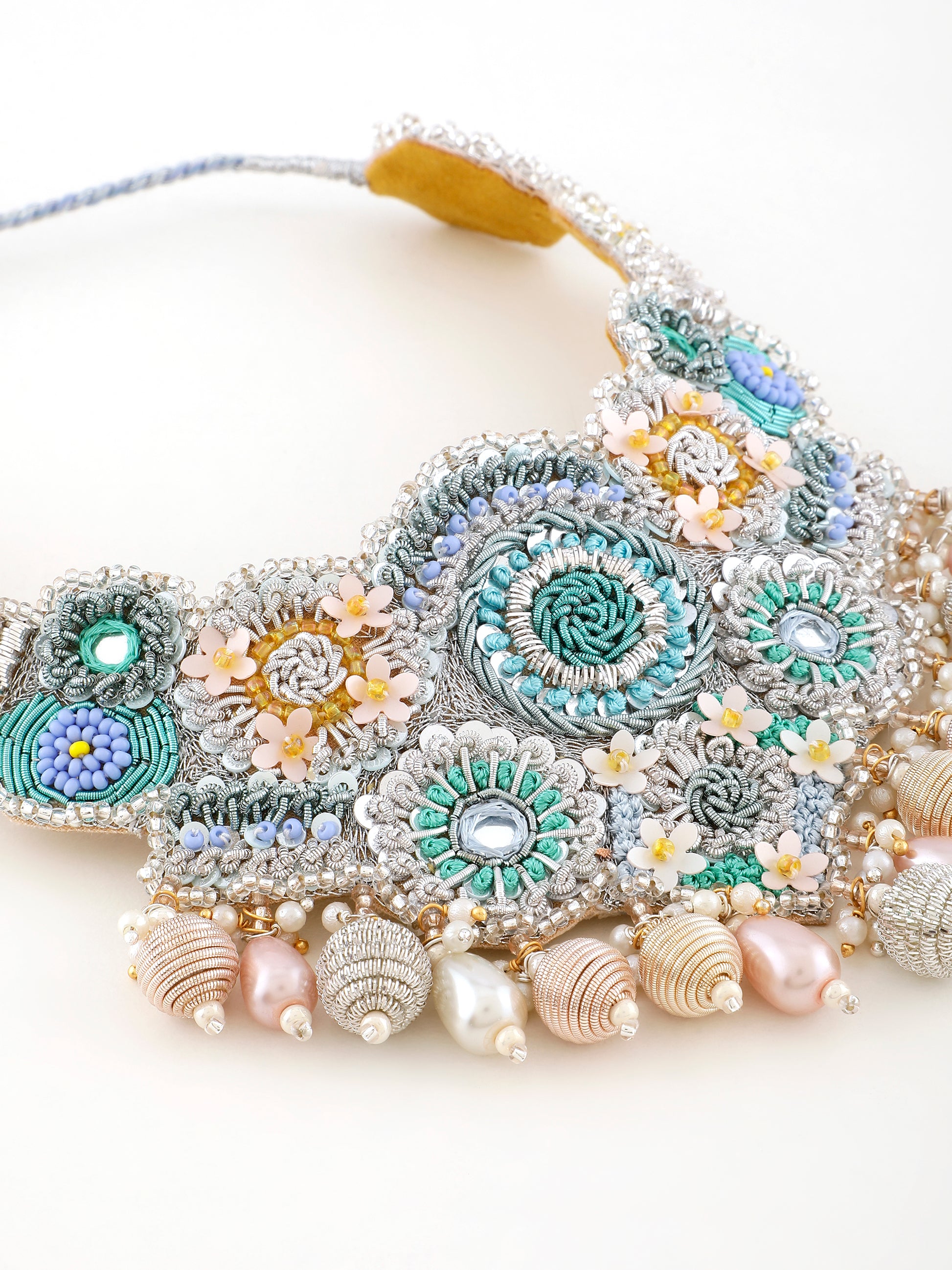 Each piece is meticulously crafted using intricate hand embroidery techniques on a textile base.
